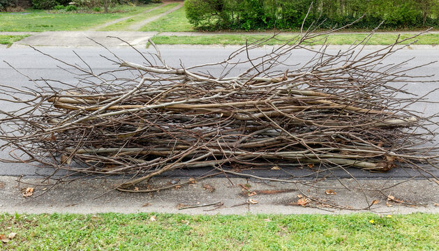 Plastic bags with branches close-up on the street. Waste from gardening. Dry branches after pruning trees in spring. Seasonal garden cleaning.