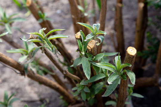 Pruned branch of a butterfly bush growing fresh new leaves, garden plant care, pruned tree budding