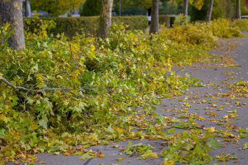 Cut pile of pruned tree branches stacked against neighborhood street curb.