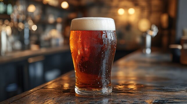 Frothy dark beer mug with condensation on bar counter under warm amber lighting