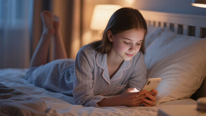 Bedside self-care routine for hormonal health: teen in pajamas using mobile app to check her menstrual calendar