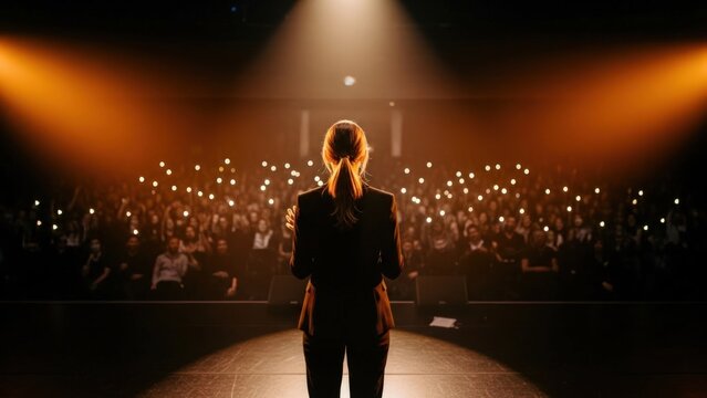 Solo speaker on illuminated stage, back to camera, addressing large, phone-lit audience under warm spotlights