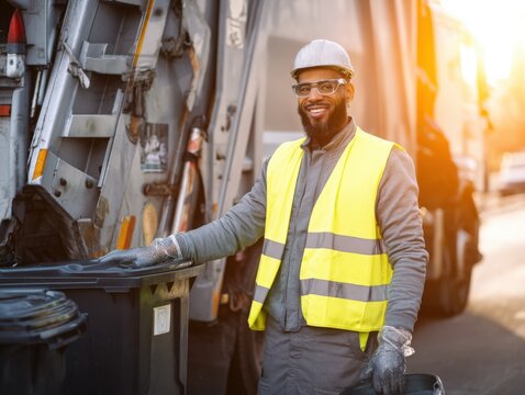 Cheerful sanitation worker next to a garbage truck, representing waste management and public service. Perfect for environmental campaigns, city services, and recycling initiatives.