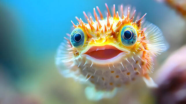 Close-up of a vibrant, spiky pufferfish with large eyes and an open mouth against a blurred underwater background.