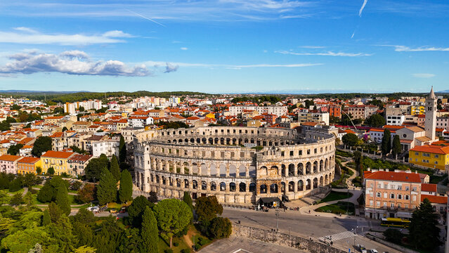 Aerial shoot of Arena ancient Roman amphitheater Old town Pula, Istra region, Croatia.