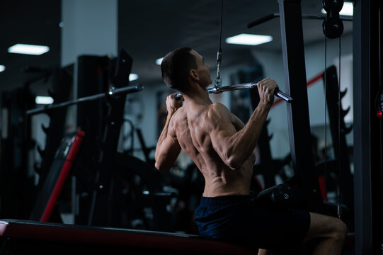 Shoulder pull down machine. Fitness man working out lat pulldown training at gym. Upper body strength exercise for the upper back.