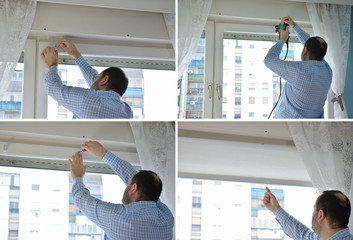 Four pictures showing a process of installing blinds. Measuring and marking, drilling, attaching elements with a screwdriver and pulling down the installed blind.