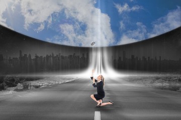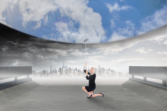 Professional woman wearing glasses sitting in bright office, gazing through striped blinds