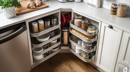 Kitchen access mechanism Magic corner for Blind Corner Cabinets. Solution for a kitchen corner storage in cupboard. Corner unit with pull out shelves for cookware.