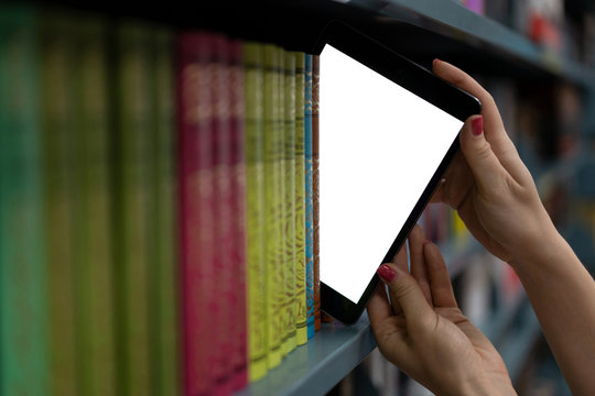 Male right hand choosing and picking orange book in public library. Pulling off selected textbook. Education research and self learning in university life concepts