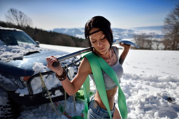 young athletic woman pulling car in winter