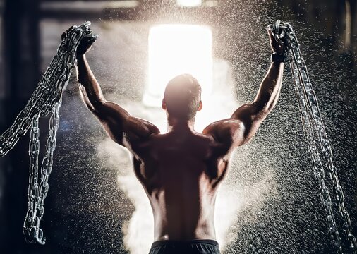 Man freeing himself from thick chains with intense white light entering dark warehouse