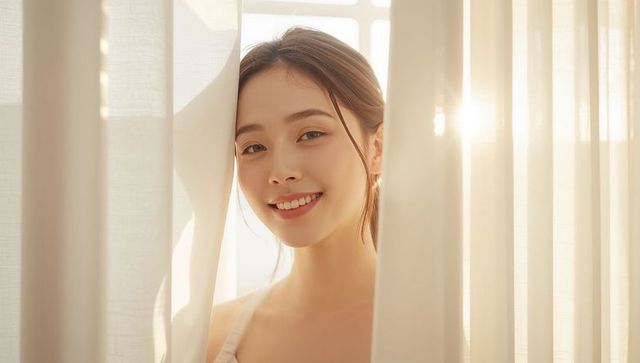 Asian woman smiling behind sheer curtains with warm backlight and soft morning glow