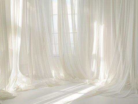 apartment white wall room with sheer long white curtains and soft light coming through backdrop