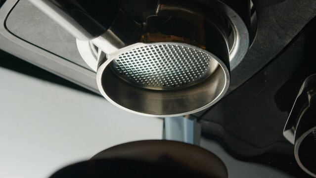 Close-up of espresso machine pouring fresh coffee into portafilter