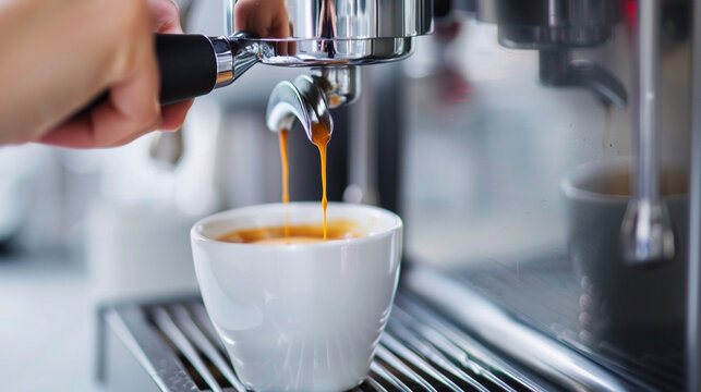 Close-up of a barista pulling a perfect espresso shot with a gleaming machine