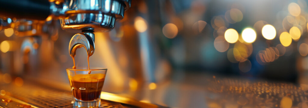 An artistic shot of espresso coffee being pulled from a high-end espresso machine in a café.