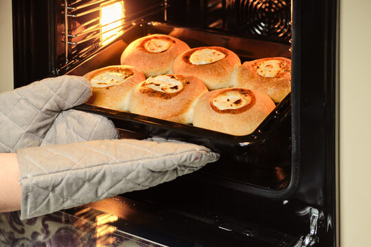 Female hands in mittens take bakery products off the oven