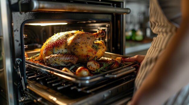 Cooking roasted chicken in oven at home kitchen