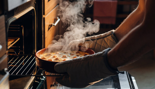 A cook in oven mitts carefully pulls a hot, steaming homemade casserole from the oven