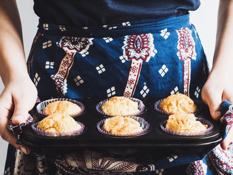 Young woman holding a tray of fragrant cupcakes that she had just pulled out of the oven