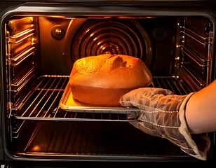 Artisan bread loaf baking in illuminated kitchen oven