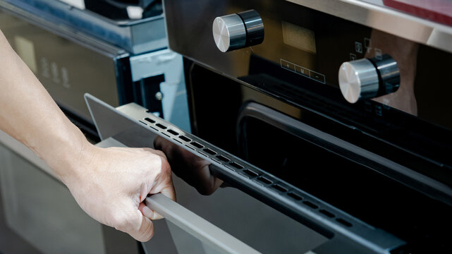 Woman opening a modern oven in a sleek kitchen. The oven interior is illuminated and ready for baking. Hand carefully pulls the handle, revealing the warm, glowing racks inside