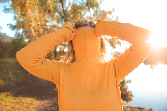 Woman pulling orange sweater over her face