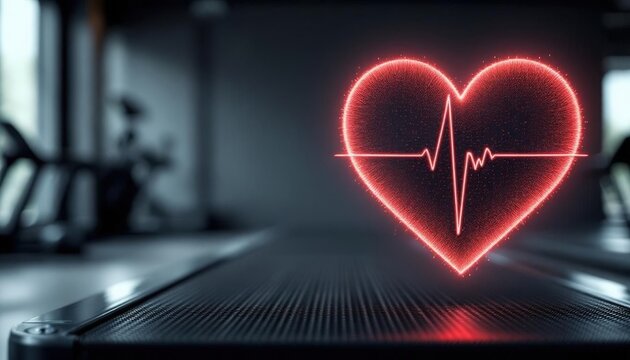 ultra photorealistic product photo of pulsating heart shaped as gym treadmill on graphite gray gym background