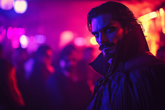Dracula revels in a vibrant neon club, caught between shadows and pulsating lights in a modern nightlife adventure