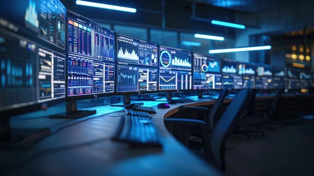 Data Center Control Room: A futuristic control room pulsates with the energy of data, showcasing a wall of screens displaying intricate graphs and charts, illuminating the path to success.
