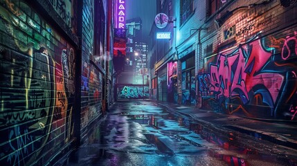 A nighttime scene of an urban alleyway illuminated by neon lights and covered in vibrant graffiti art, reflecting the dynamic and lively atmosphere of the city at night.