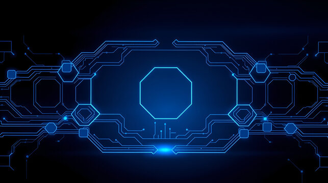 Smooth dark blue background with pulsating circuits and symmetrical hexagons creating a futuristic interface feel