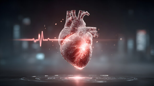 Abstract medical animation of human heart diagnostics, glowing pulse line, holographic data layers and ECG feedback, concept of AI-driven cardiology and futuristic health tech