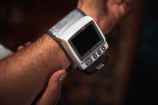 Close up of a person s arm with a digital blood pressure monitor showing high readings