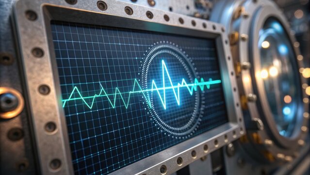 Quantum computing in healthcare concept. Futuristic display panel showing a heartbeat waveform in a metallic environment.