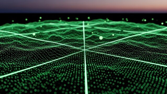 Pulsing rgb dot matrix in dark cyberspace with neon green wireframe geometry