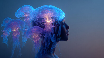 A surreal double exposure photograph blending a calm human profile in meditation with deep ocean bioluminescent jellyfish pulsing with gentle blue and purple light waves.