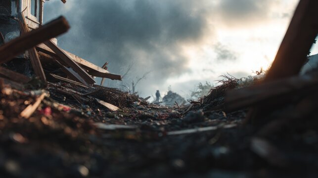 Wreckage amidst ruins, a poignant testament to the destructive forces aftermath