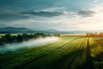 Aerial view of a large farm field in summer with visible pesticide spray clouds drifting across crops