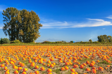 Orange pumpkins patch at outdoor farmer market.  Landscape harvest farm field with blurry farmer picking pumpkin in Sunny day Autumn or Winter