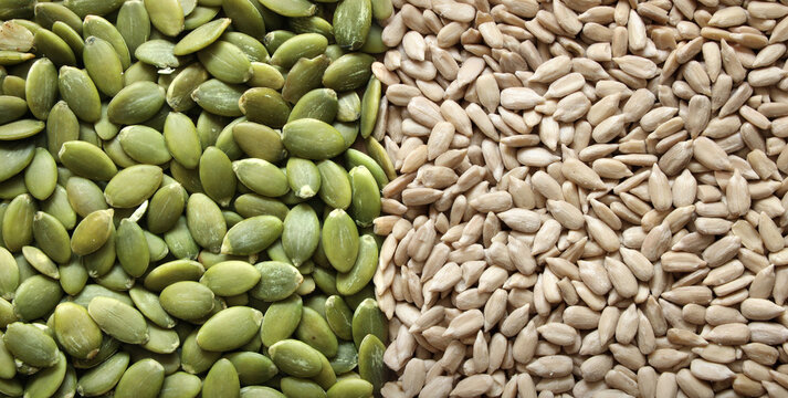 Creative layout made of pumpkin and sunflower seeds. Flat lay. Food concept. Seeds pattern concept. Macro image.