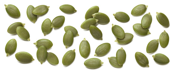 Green pumpkin seeds set isolated on white background. Single seed collection