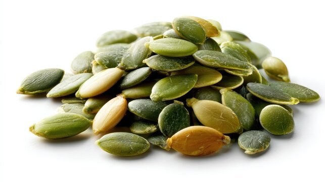 Green and organic healthy pumpkin seeds; peeled kernels of pumpkin on white background. Vegan and vegetarian super foods. Seeds and grains healthy diet.