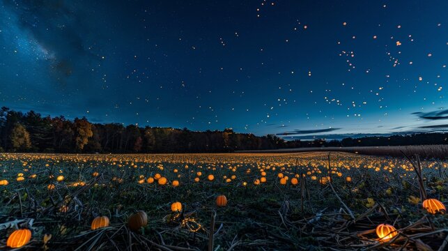 Halloween pumpkin patch with glowing jack-o-lanterns
