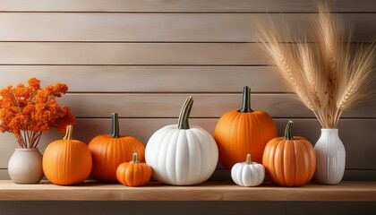 Festive array of autumn pumpkins against a smooth peach backdrop, vibrant harvest season