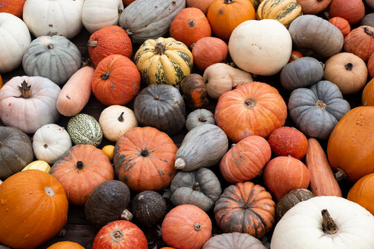 Pumpkins and gourds at the farm during a pumpkin patch for a natural Fall background.