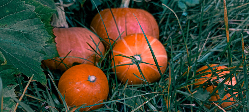 ripe orange pumpkins in autumn field, halloween, fall, harvest, farm, garden, october 31, agriculture, nature, farming, growth, vegetable, harvesting, plant