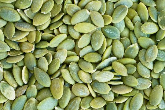 raw, organic, shelled pumpkin seeds background and texture - superfood concept