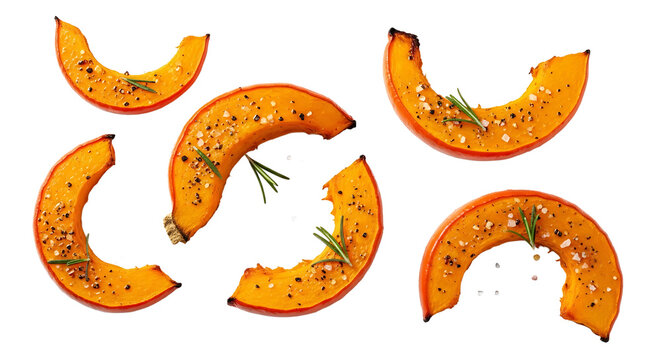 Pumpkin - slices on cutting board - on white background top-down space for text